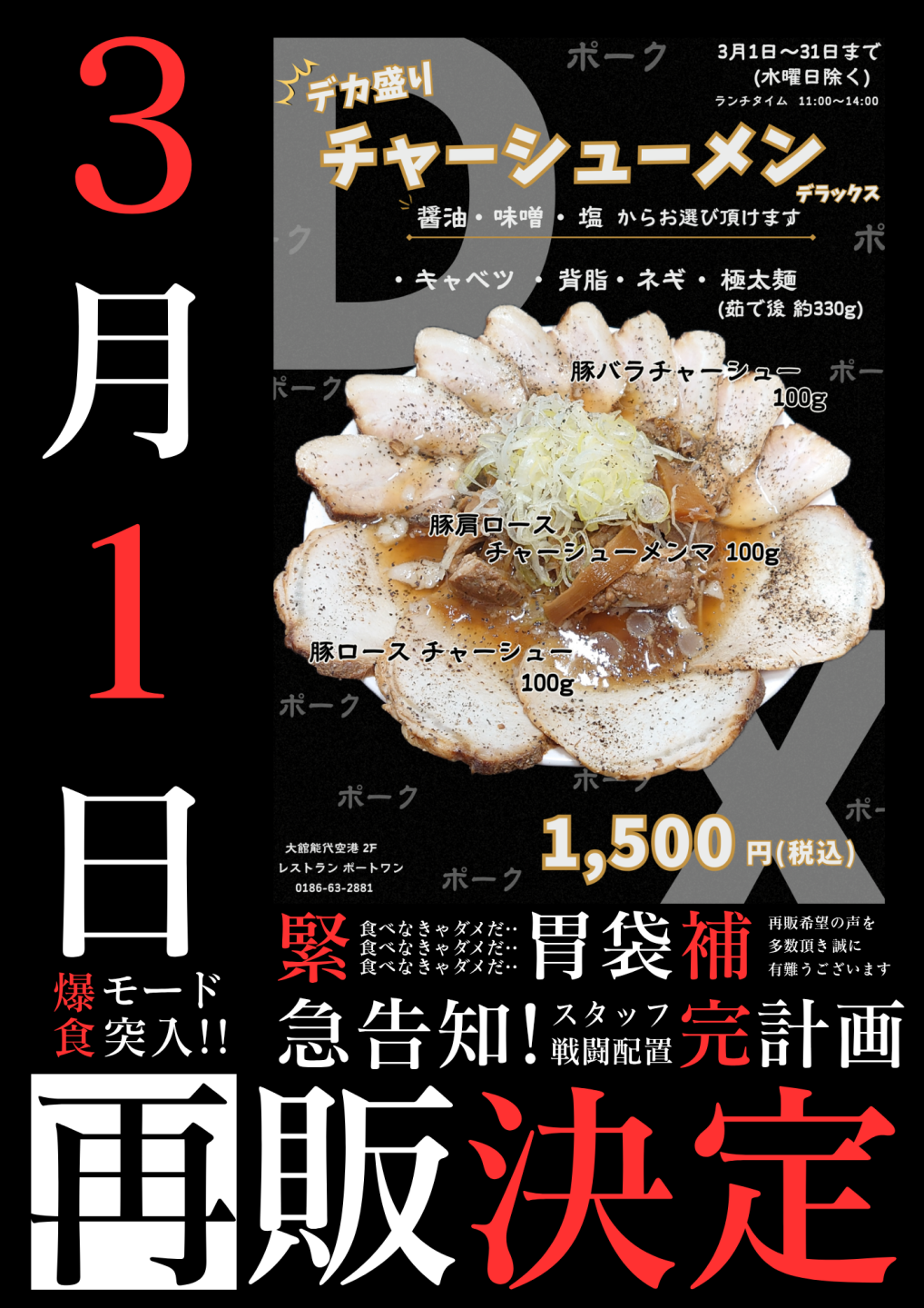 「またやってほしい!」というたくさんの声にお応えし、三度あのメニューが帰ってきた!『デカ盛り チャーシューメンデラックス(税込1,500円)』!!