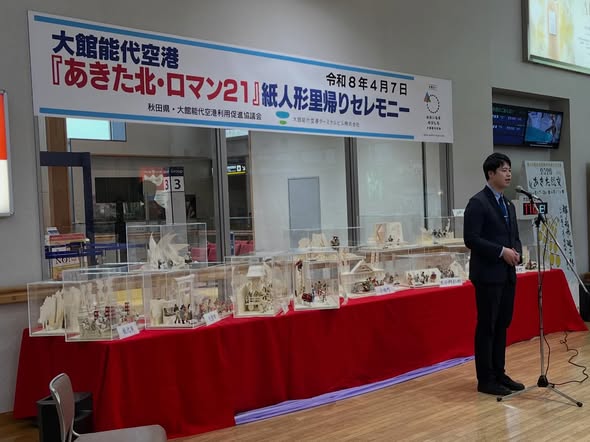 2026年4月7日、1998年の開港時からターミナルビル2階に展示されていた、空港圏域観光PRコーナー『あきた北・ロマン21』の紙人形がそれぞれの市町村に里帰り...