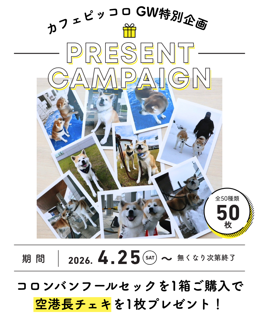 カフェピッコロでは、4月25日(土)より「コロンバン フールセック」をご購入のお客様へ、「あきたいぬ空港長チェキ」をプレゼントいたします。