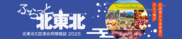 メディア掲載情報 ホーム メディア掲載情報 2025年11月09日 北東北5空港合同情報誌『ふらっと北東北2025』刊行! 青森空港、三沢空港、いわて花巻空港、秋田空港、大館能代空港の各ターミナルビル運営会社は、北東北5空港合同情報誌『ふらっと北東北2025』を刊行しました。...