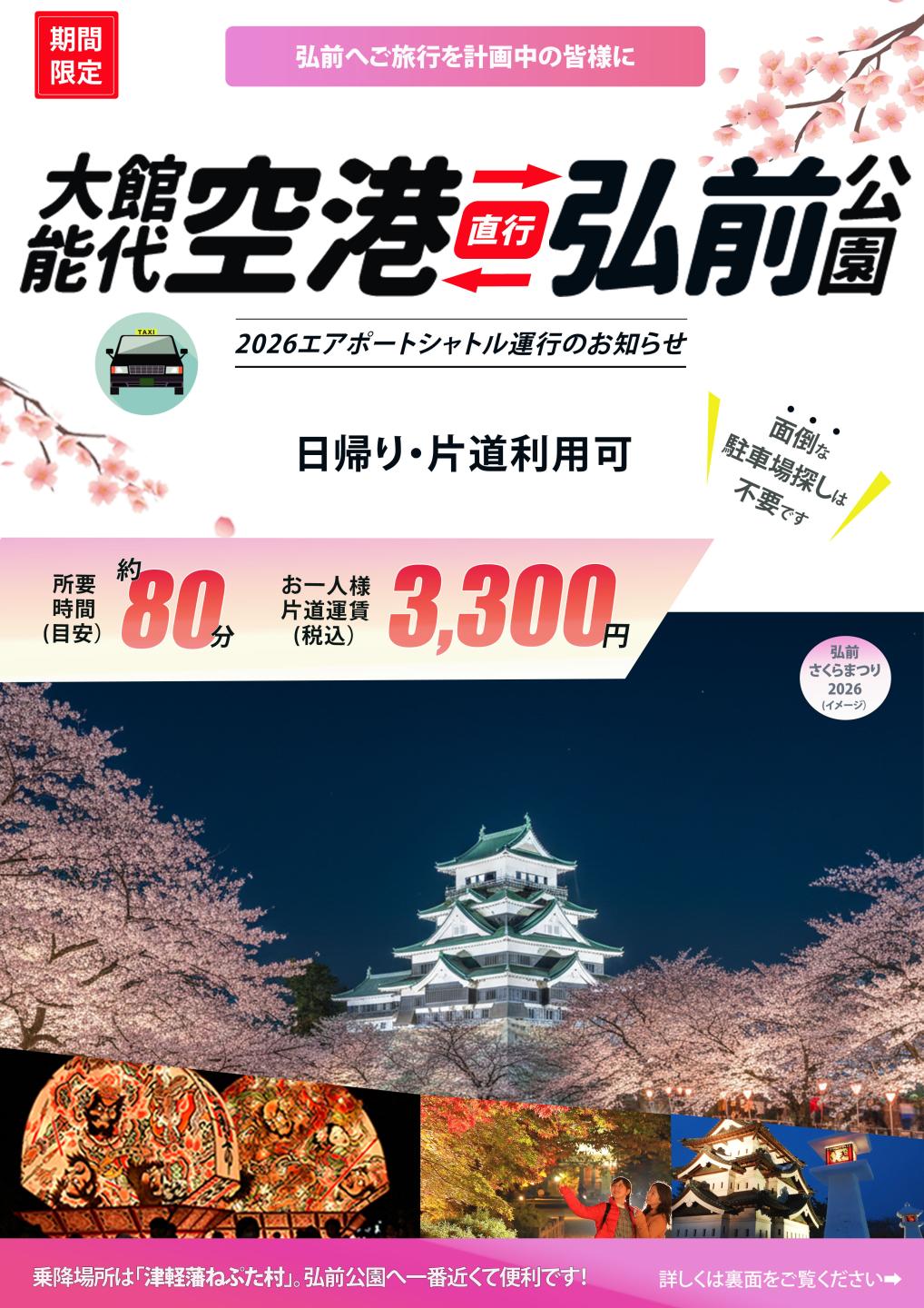 大館能代空港から弘前公園まで、直行80分。(予約制)