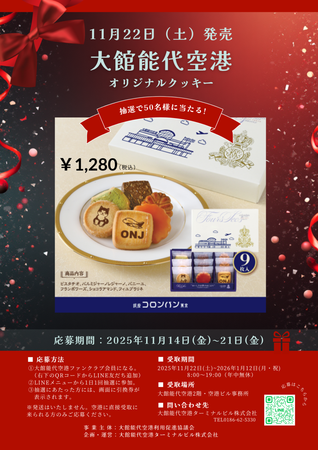 「コロンバン×大館能代空港オリジナルクッキー」が抽選で50名様に当たるプレゼント企画が始まりました。大館能代空港ファンクラブ会員様限定!LINEのお友達登録で参加できます!詳細はこちら