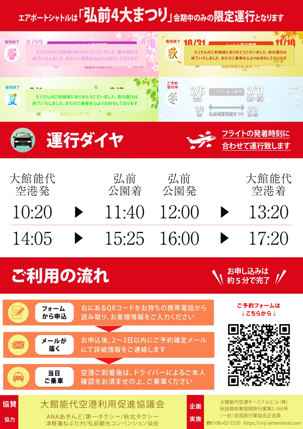 今年も「弘前4大まつり」に合わせ、大館能代空港⇔弘前 エアポートシャトルを限定運行いたします。乗降場所は「津軽藩ねぷた村」弘前公園へ一番近くて便利です!